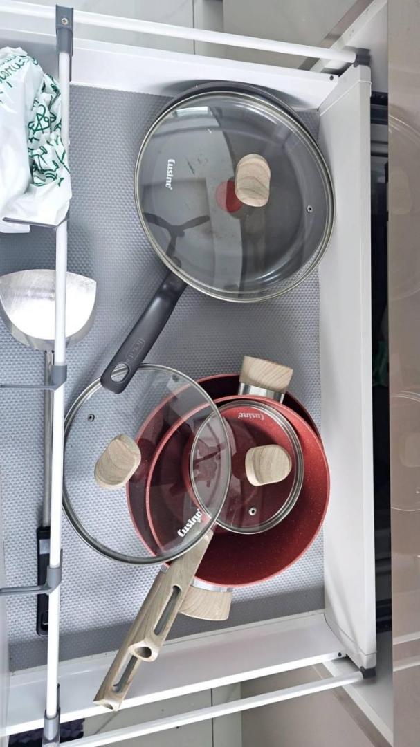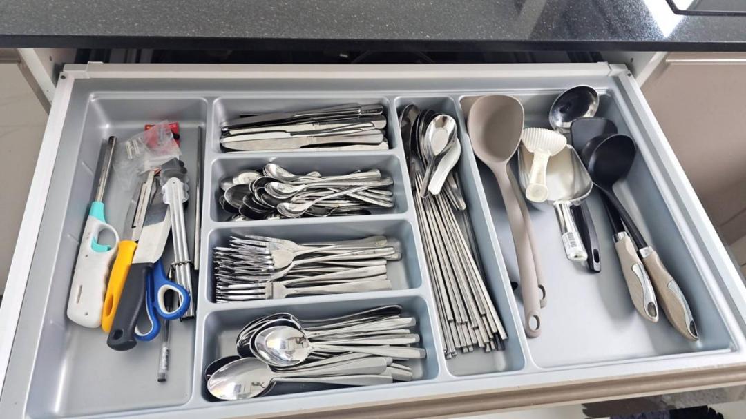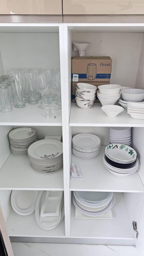 หม้อ กระทะ จาน ช้อน แก้วน้ำ เครื่องตัดแต่ง มีด หม้อหุงข้าว เตาปูนและเตาไมโครเวฟ ขนมปังปิ้ง ถังน้ำแข็ง