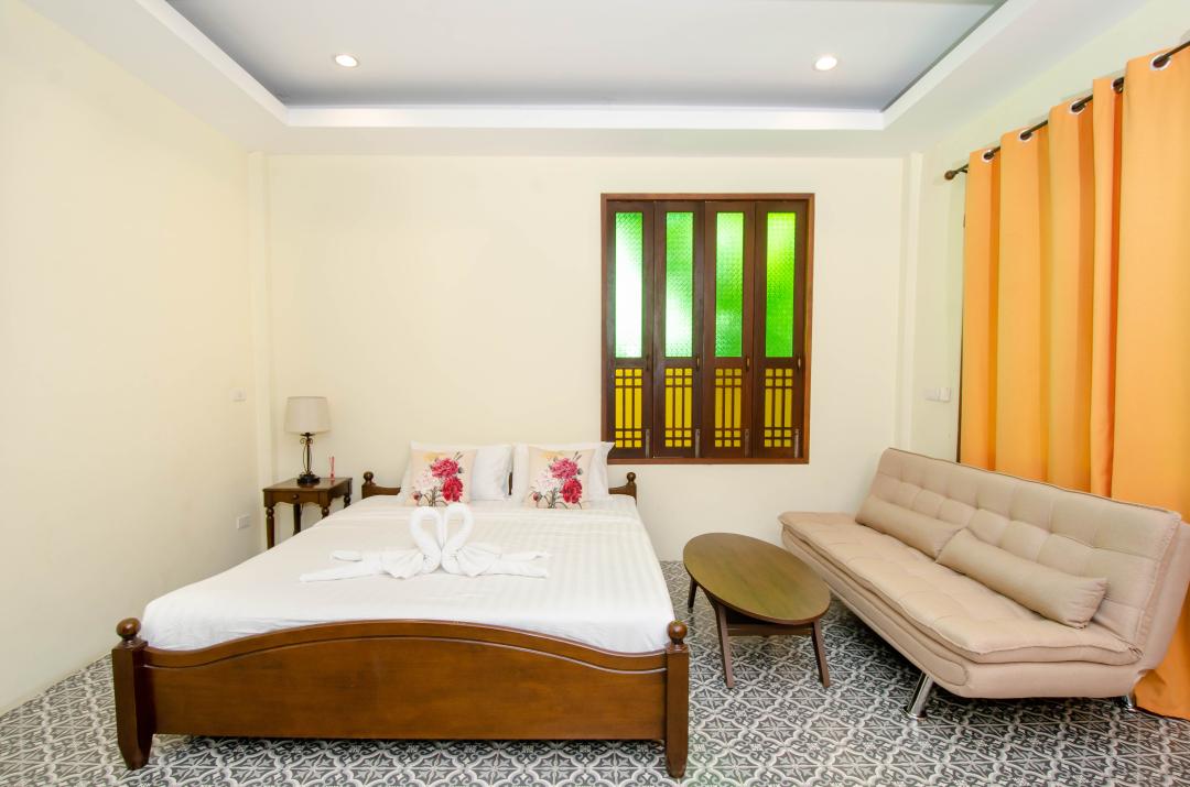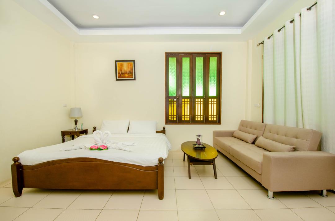 ชั้นที่ 1 ห้อง 1-6 เตียง 6 ฟุต เตียงเสริมโซฟาเบด ตู้เย็นตู้เสื้อผ้าทีวีทุกห้อง