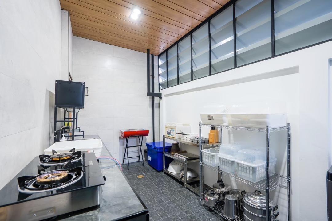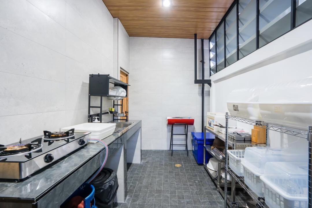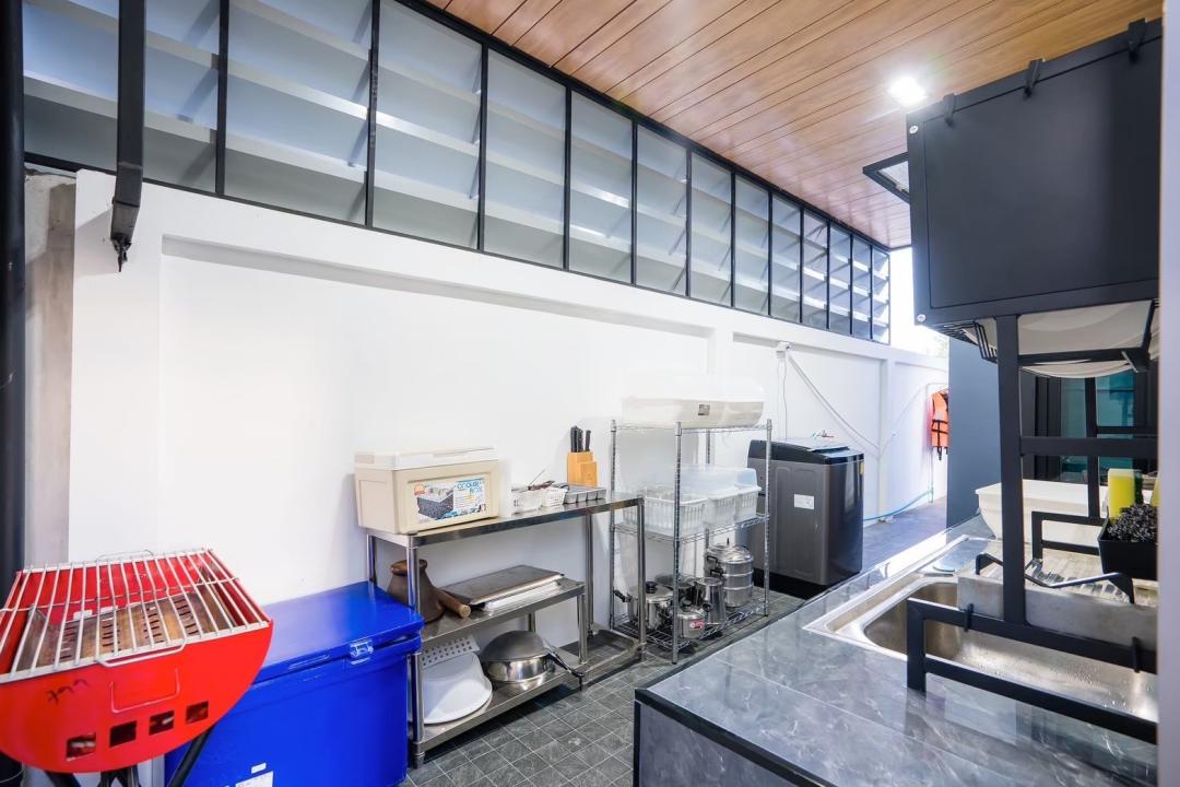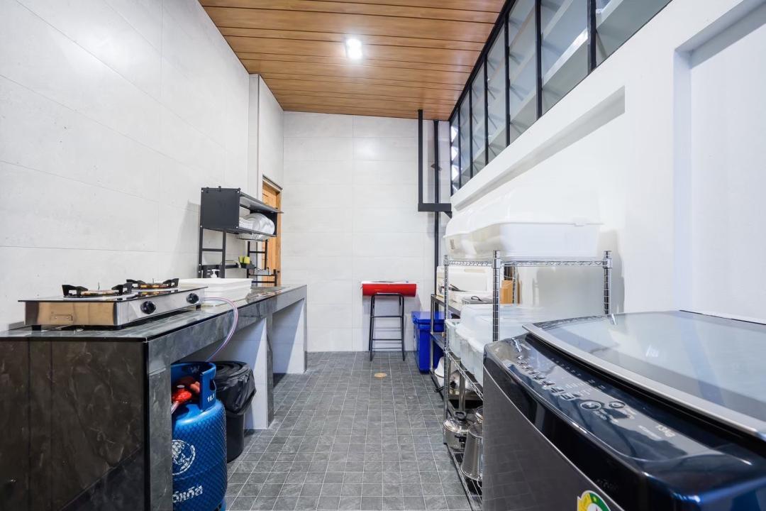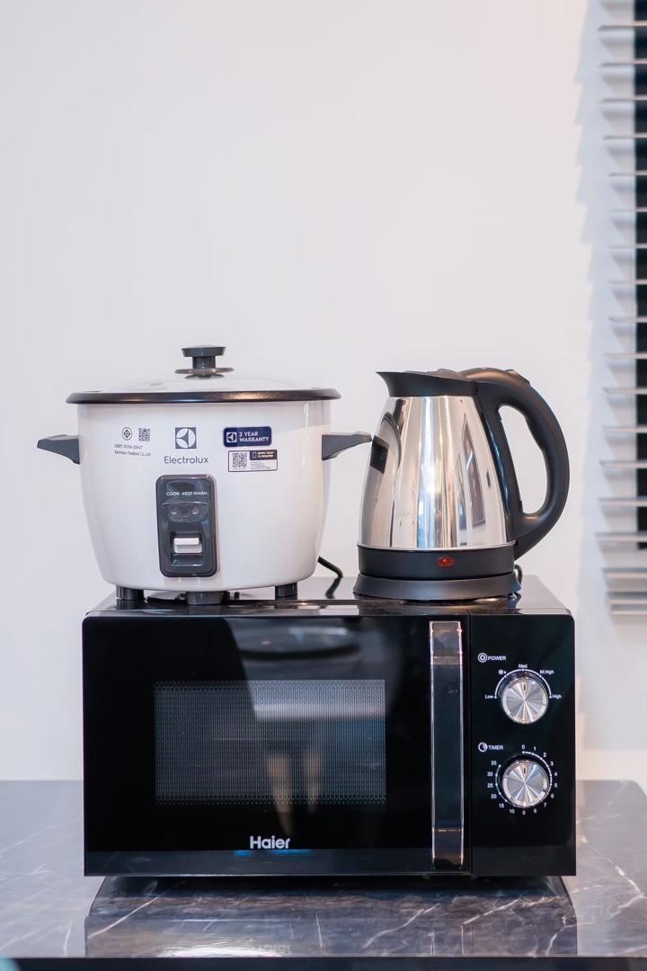 ครก สาก เขียง มีด จาน ชาม ช้อน กะละมังล้างผัก เเก้วนำ้ดื่ม แก้วไวน์ เเก้วเบียร์ แก้วกาแฟ หม้อ กะทะ ตู้เย็น ถังแช่นำ้แข็ง ไมโครเวฟ กานำ้ร้อน หม้อหุงข้าว เครื่องปิ้งขนมปัง เตาแก๊ส เตาปิ้งย่าง มีถังน้ำแข็งให้บริการ
