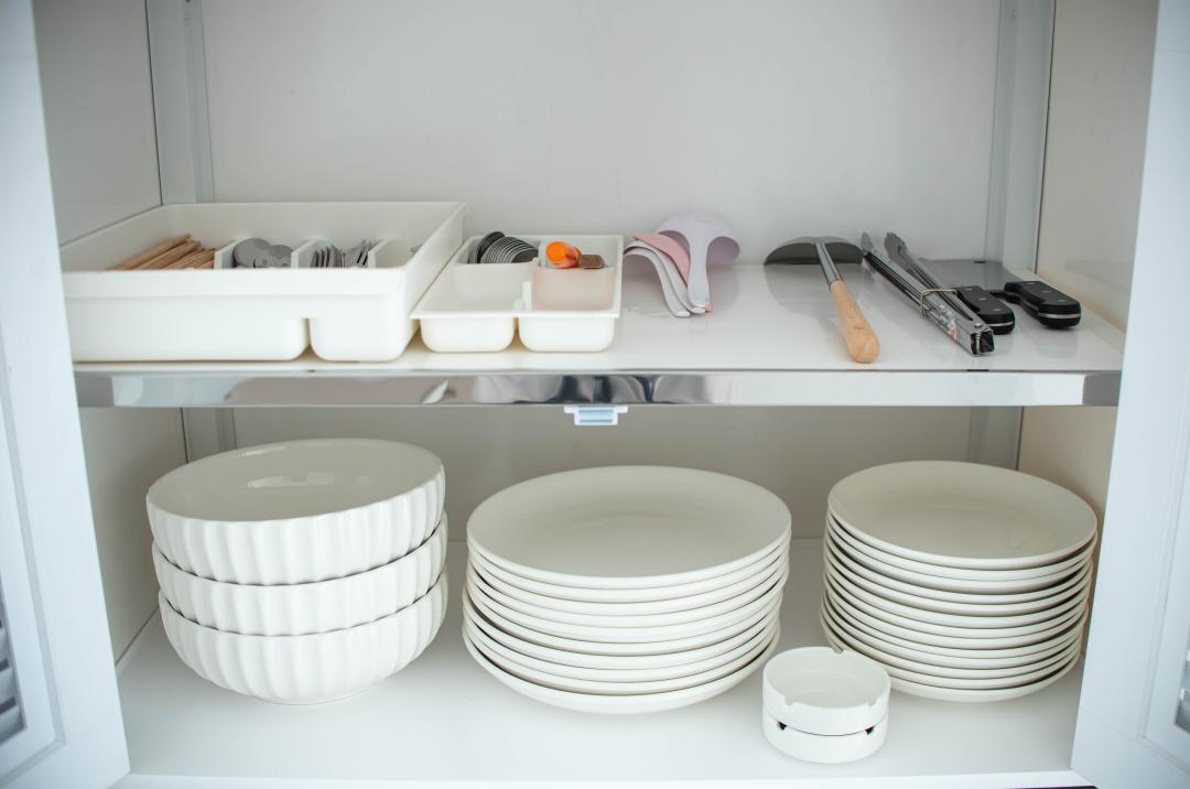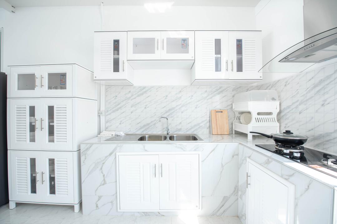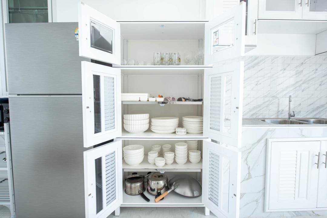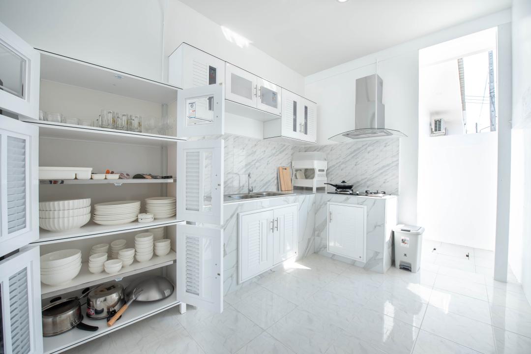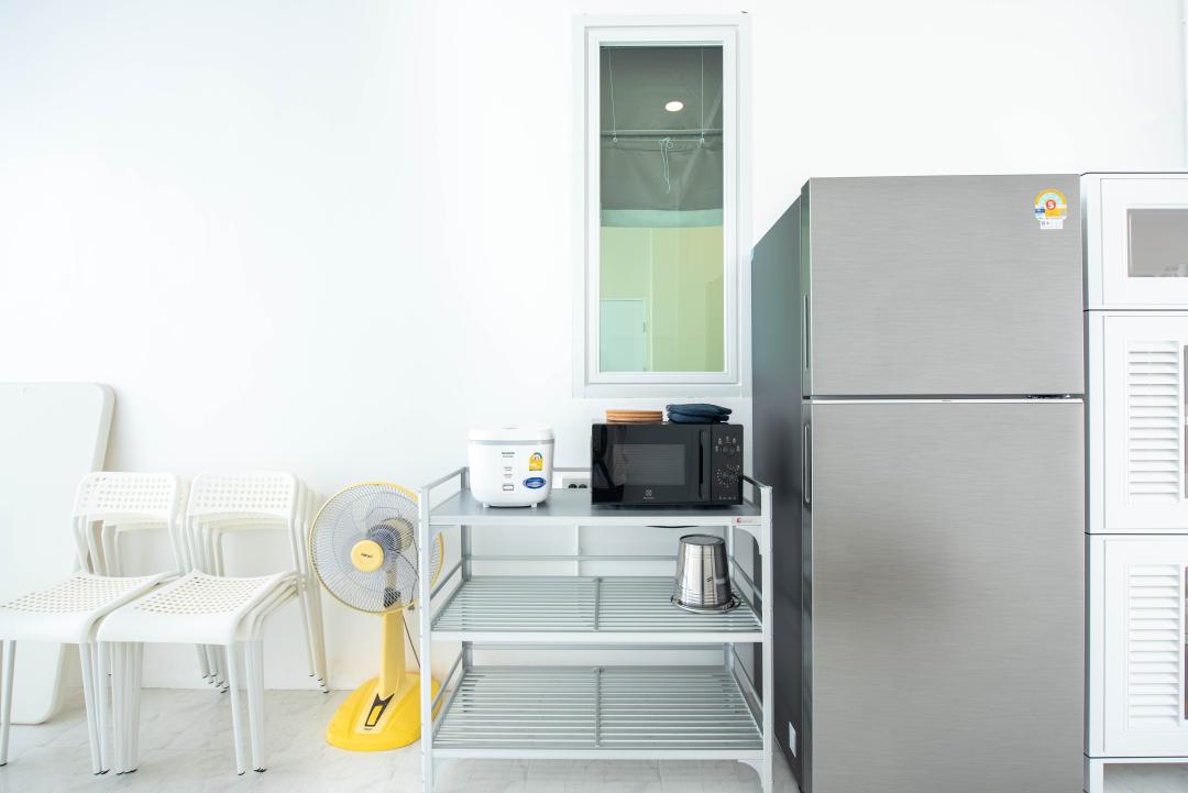 จานชาม ช้อน แก้วน้ำ หม้อ กระทะ เขียง มีด เครื่องปั่นเล็กๆ ครก หม้อหุงข้าว ไมโครเวฟ เตาแก๊ส กาต้มน้ำ หม้อทอดไร้น้ำมัน เครื่องปิ้งหนมปัง ซึ้ง