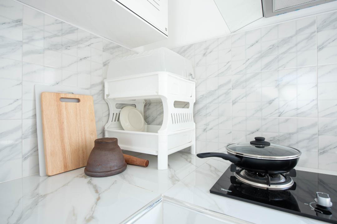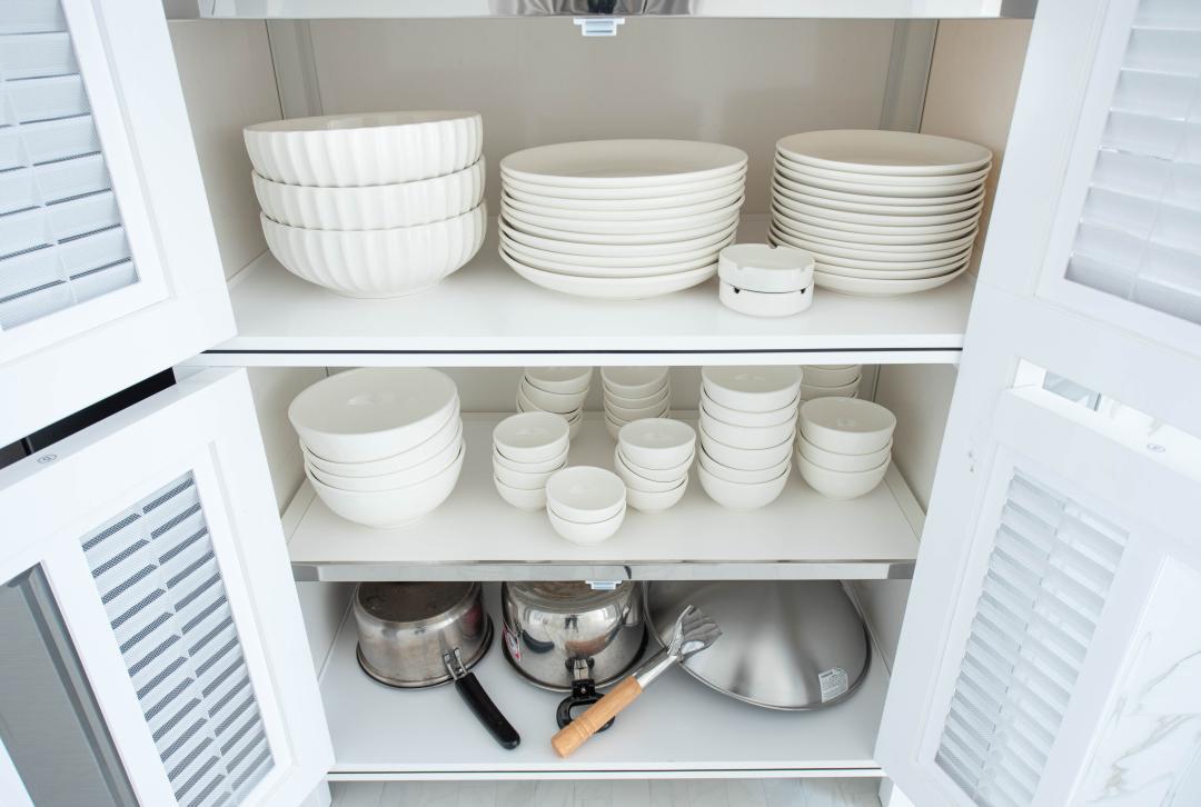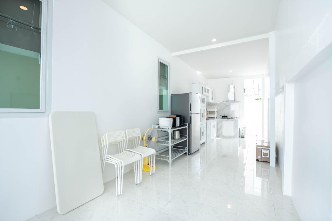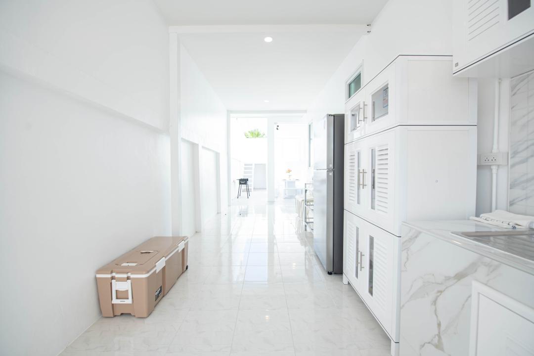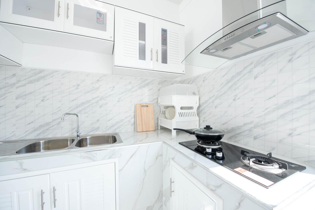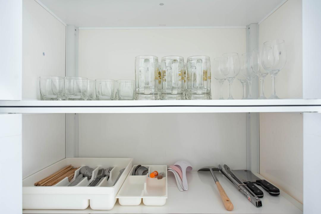 จานชาม ช้อน แก้วน้ำ หม้อ กระทะ เขียง มีด เครื่องปั่นเล็กๆ ครก หม้อหุงข้าว ไมโครเวฟ เตาแก๊ส กาต้มน้ำ หม้อทอดไร้น้ำมัน เครื่องปิ้งหนมปัง ซึ้ง