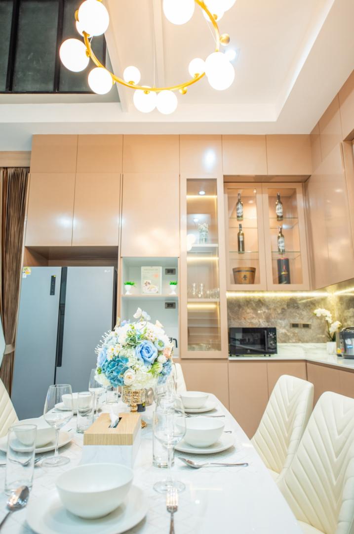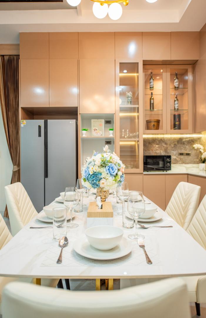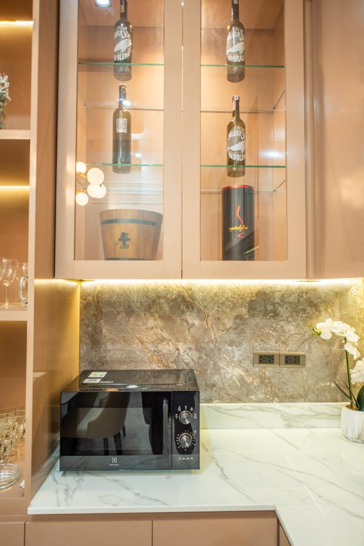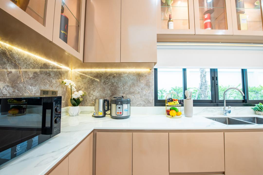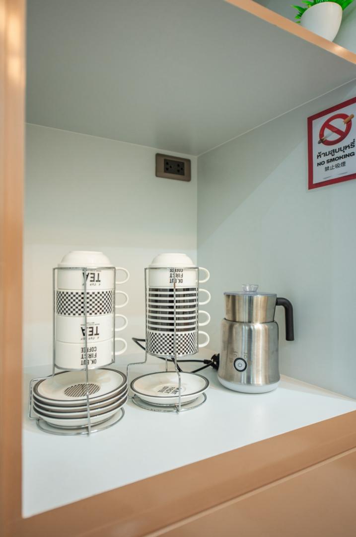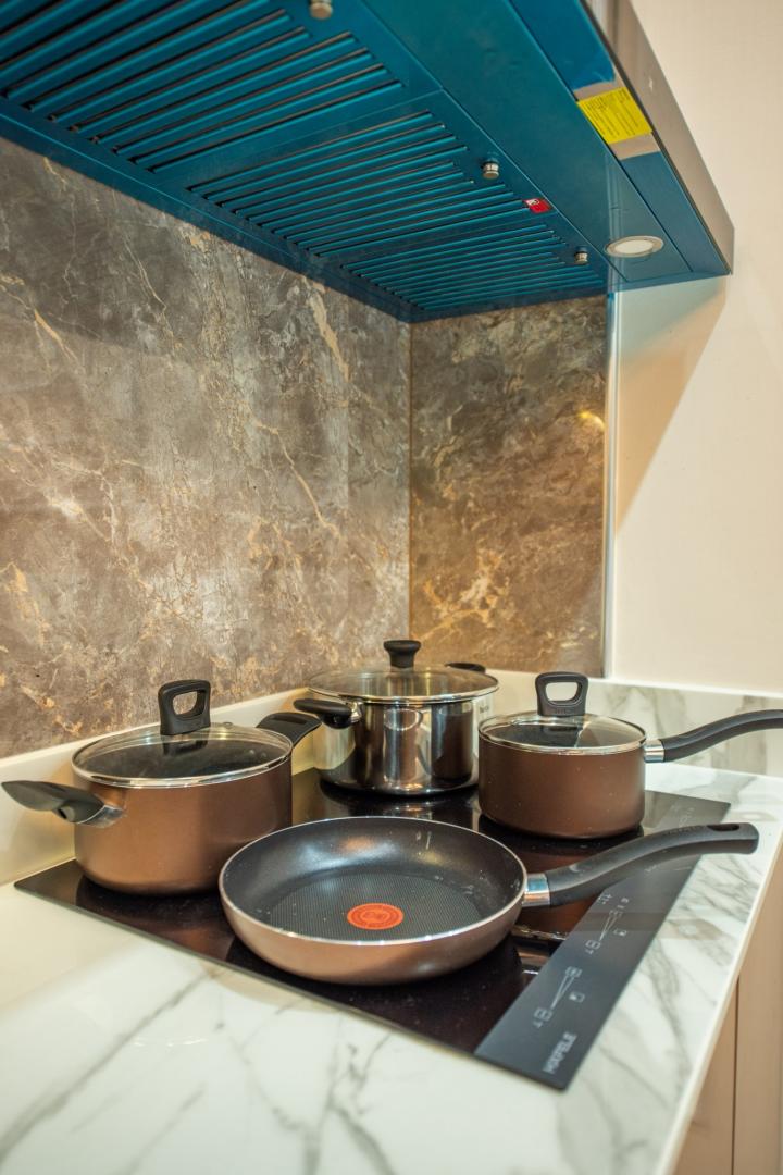 หม้อหุงข้าว หม้อสุกี้หมูกระทะ กาต้มน้ำร้อน ถ้วยจานช้อนแก้วตะเกียบ หม้อนึ่ง กระทะทอด โคก สาก เตาย่างบาร์บีคิว มีถังน้ำแข็งปิกนิก็ 2 ลิตร ไมโครเวฟ ตู้เย็น