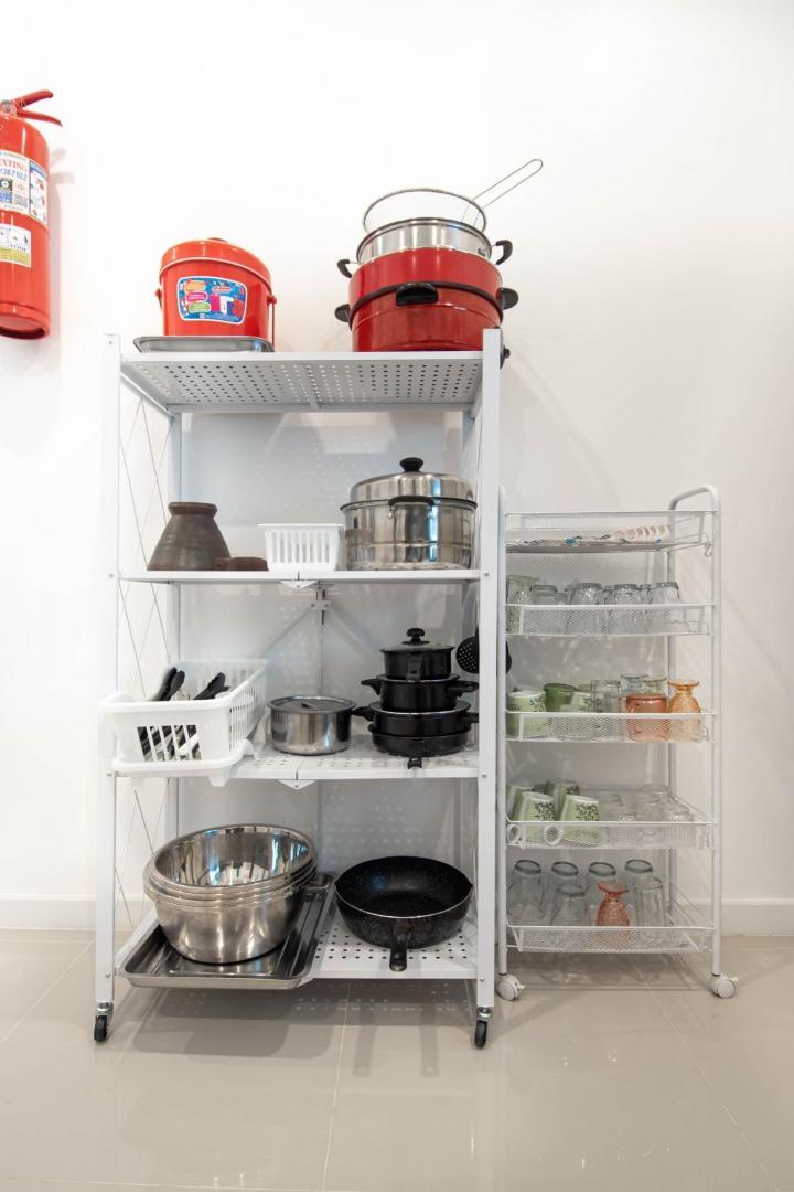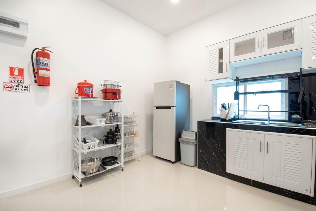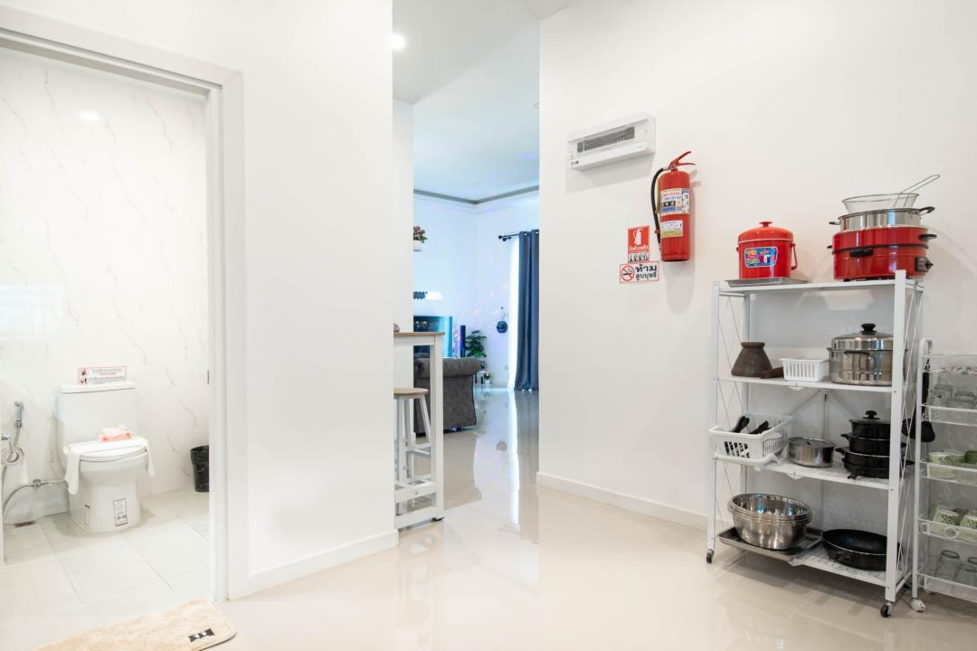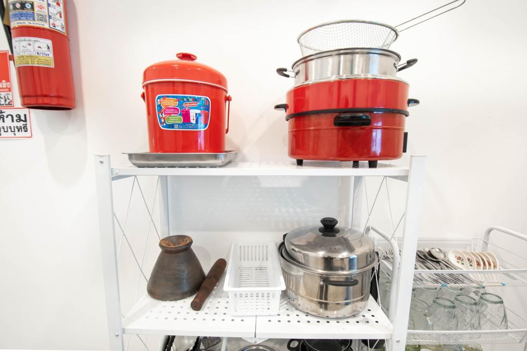หม้อ กระทะ จานชาม ช้อน เตาปิ้งย่าง แก้วน้ำ แก้ววาย เขียง มีด หม้อหุงข้าว ครก ไมโครเวฟ เตาแก๊ส กระทะไฟฟ้า ที่เปิดไวน์ ถังน้ำแข็งมีครบค