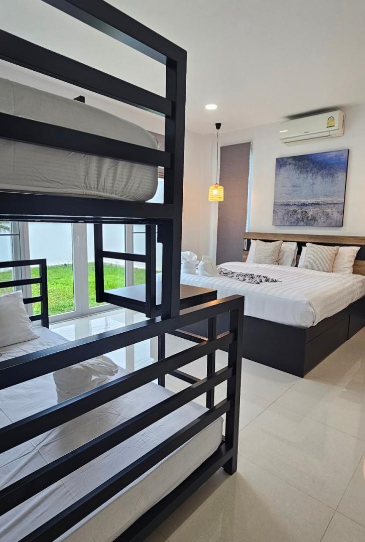 ห้องนอนที่ 2 : เตียง 6 ฟุต 1 เตียง /เตียง 3.5 ฟุต 2 เตียง (ห้องน้ำในตัว มีอ่างจากุสชี่)