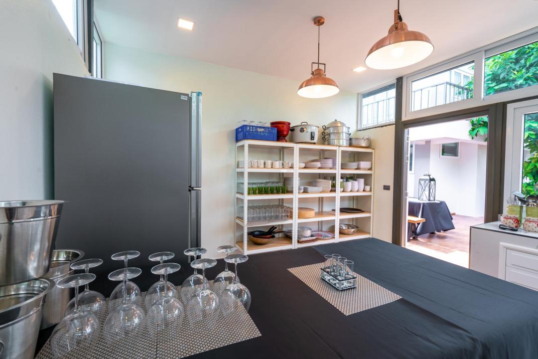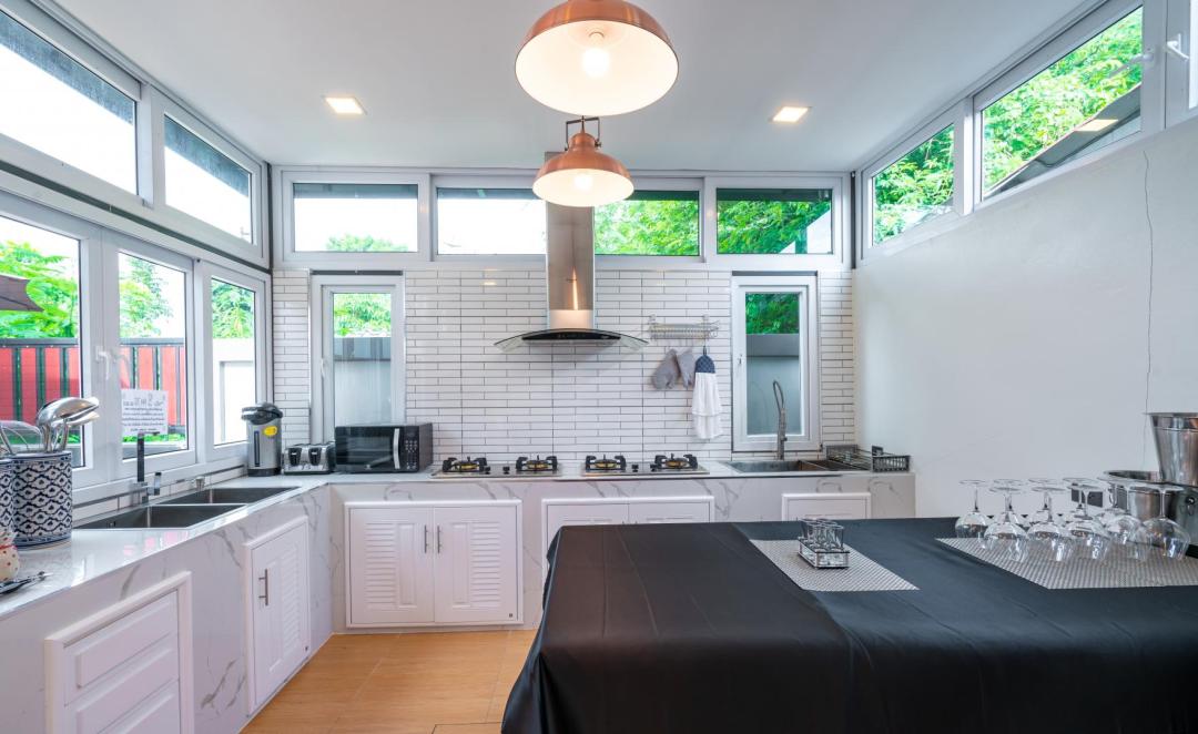 ห้องครัวตกแต่งครบครันสไตล์ยุโรป มีเตาแก๊สพร้อมเตาอบ ไมโครเวฟ หม้อหุงข้าว เครื่องปิ้งขนมปัง กาต้มน้ำ และอุปกรณ์ครบครัน