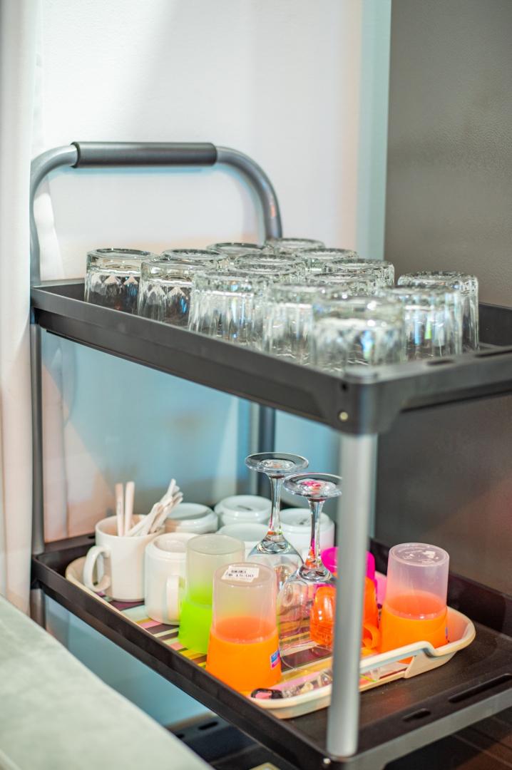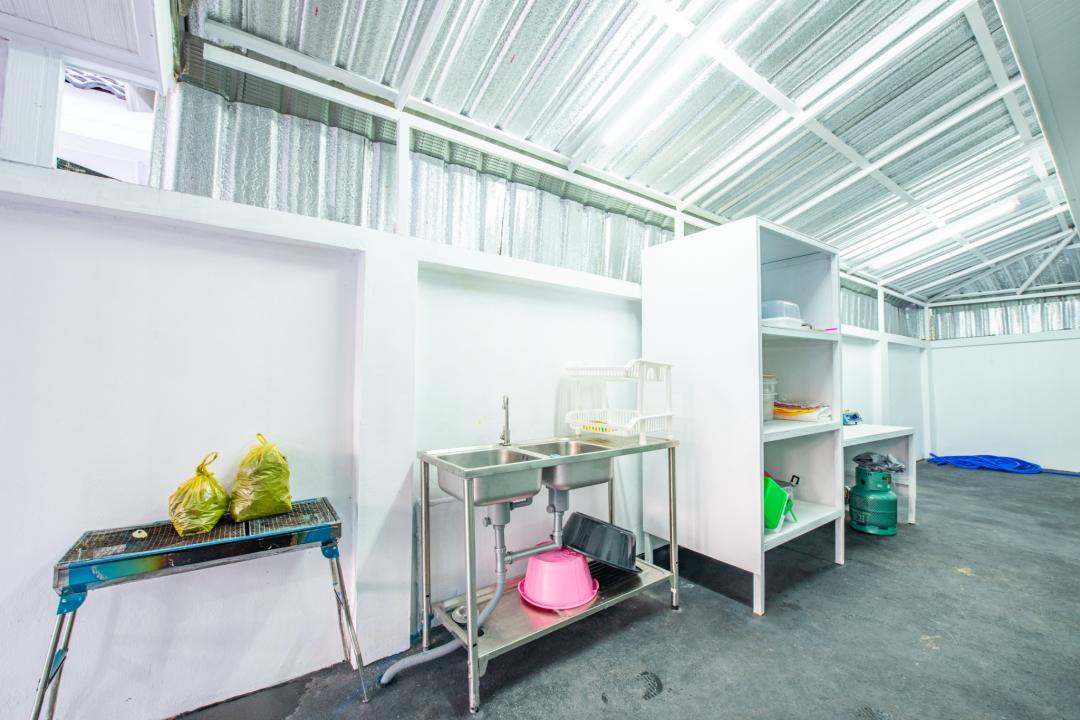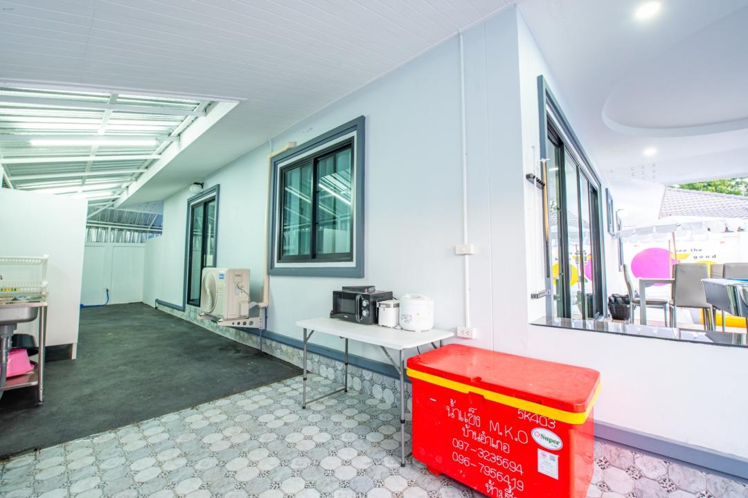 -เป็นครัวไทย อุปกรณ์เครื่องครัวครบครัน เช่น หม้อ กระทะ จานชาม ช้อน แก้วน้ำ เขียง มีด หม้อหุงข้าว ครก เครื่องปั่น ไมโครเวฟ เตาปิ้งขนมปัง ซึ้ง ถังน้ำแข็ง