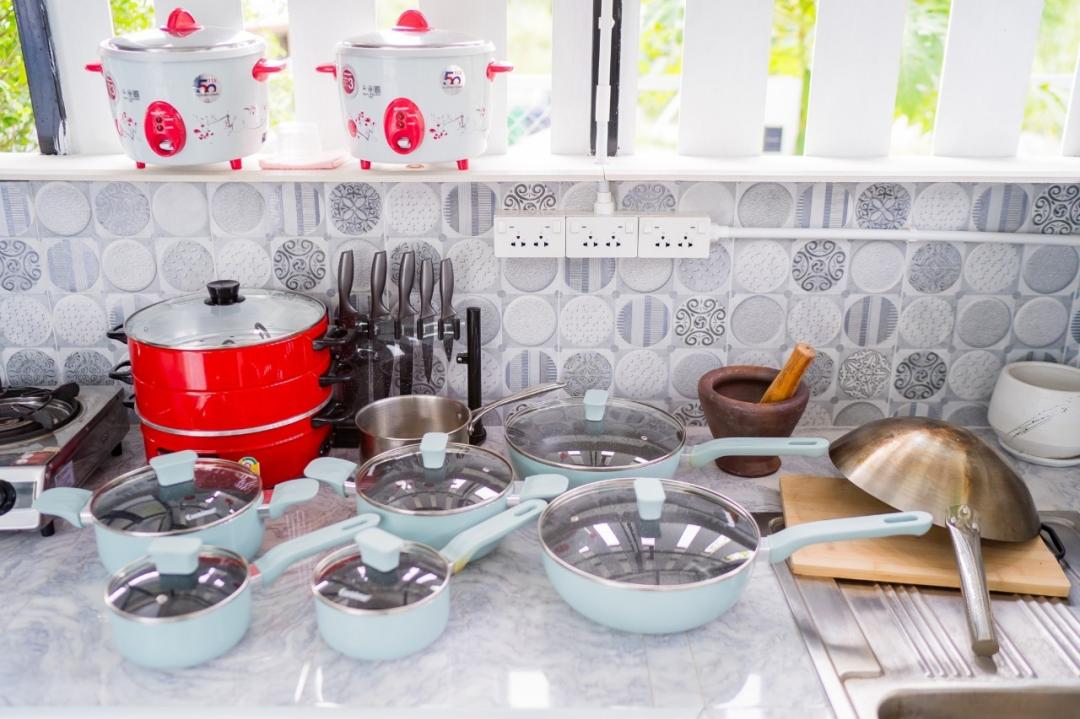 กะทะ หม้อ หม้อหุงข้าว จาน ชาม ตะหลิว ช้อนส้อม ที่คีบ ซึ้ง เครื่องปิ้งขนมปัง ไมโครเวฟ แก้ว ถ้วย ถ้วยน้ำจิ้ม มีด เขียง ครก ช้อนเล็ก ช้อนกลาง กะละมัง กาน้ำร้อน เตาอบ ทัพพี ถังน้ำแข็ง เตา bbq