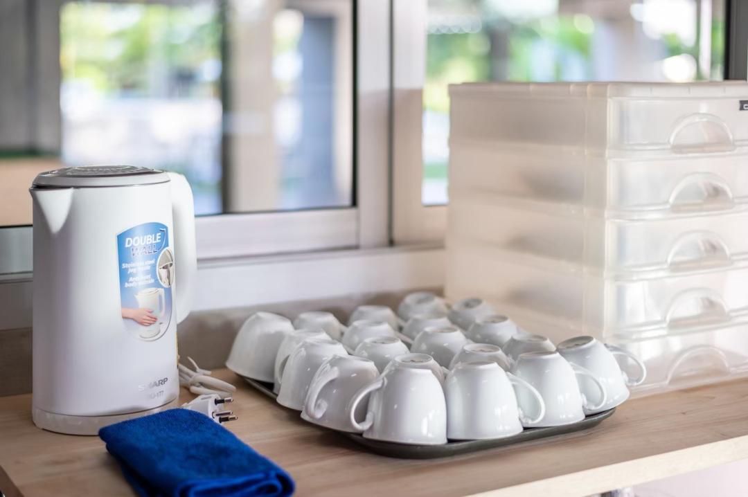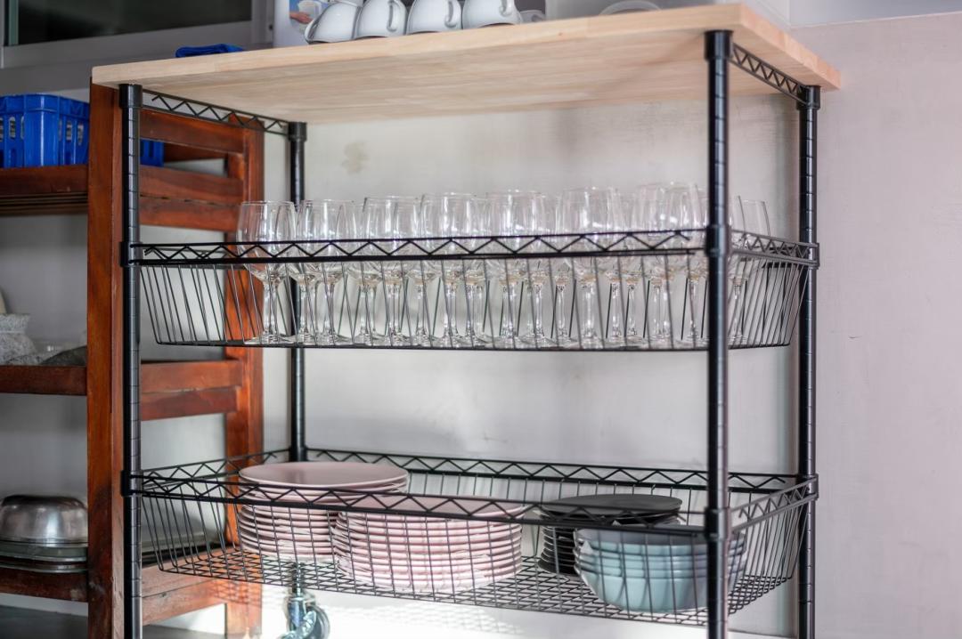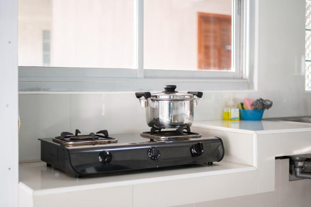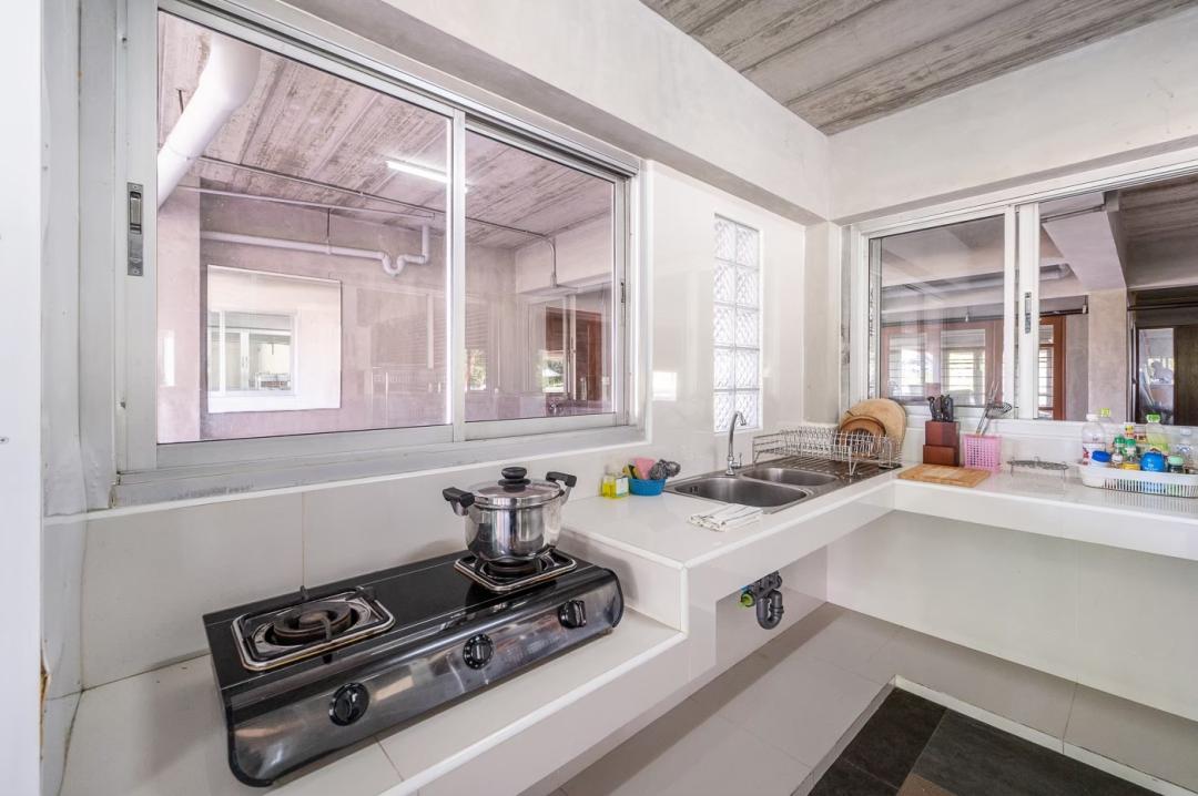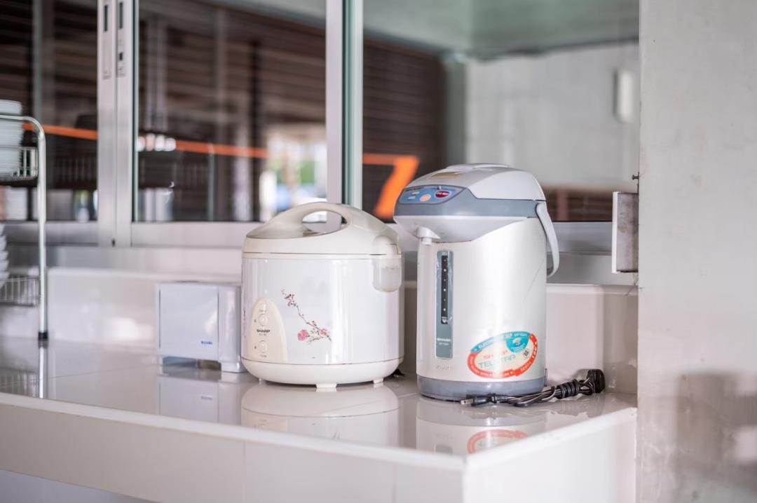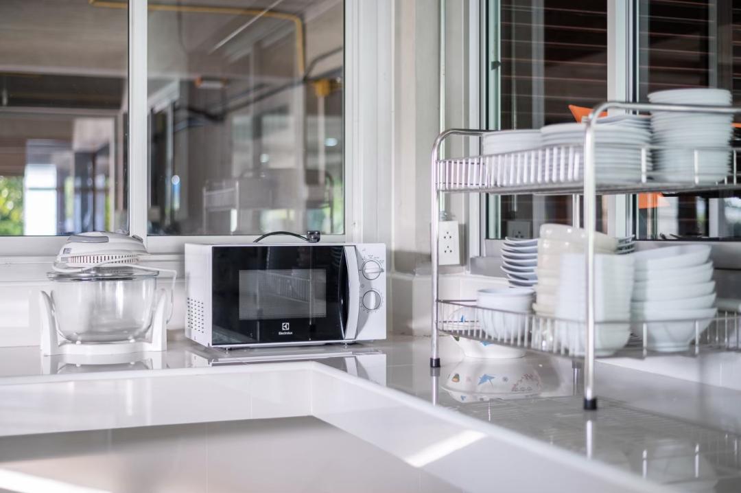 ห้องครัว พร้อมอุปกรณ์ครัวครบครัน (กาน้ำร้อน แก้ว จาน ชาม หม้อ มีด เขียง ตะหลิว ถาด กระติกน้ำร้อน หม้อหุงข้าว เตาแก๊ส ไมโครเวฟ ช้อนส้อม) + โต๊ะทานข้าว กว้างขวาง (ทั้งในบ้าน และริมสระบ่ายน้ำ)