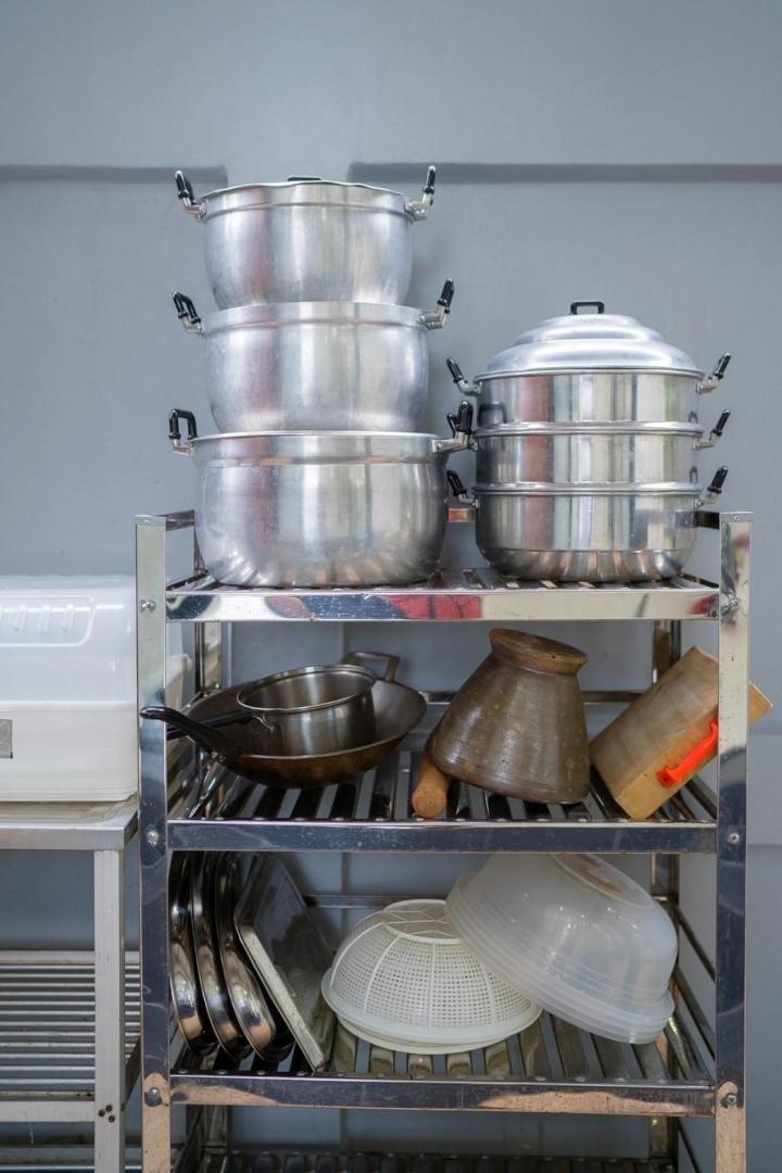 หม้อ กระทะ จานชาม ช้อน แก้วน้ำ เขียง มีด หม้อหุงข้าว ถังน้ำแข็ง