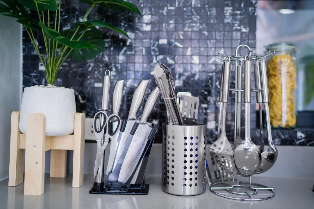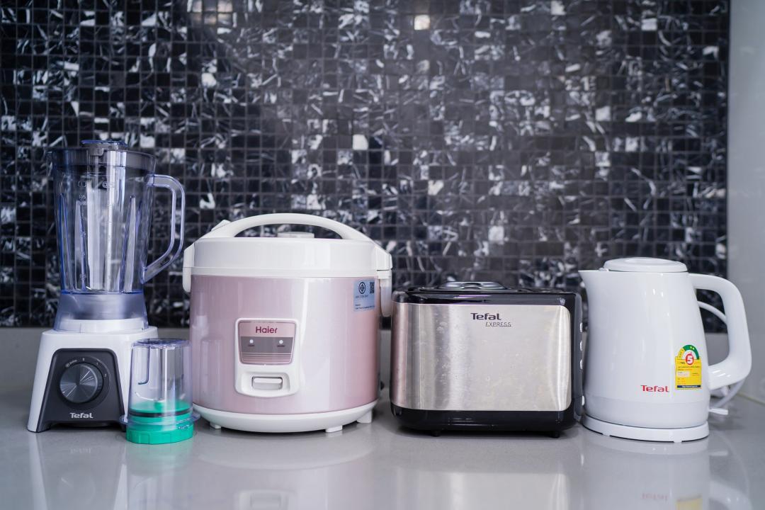หม้อ กระทะ จานชาม ช้อน แก้วน้ำ เขียง มีด หม้อหุงข้าว ครก เครื่องปั่น เตาอบ ไมโครเวฟ เตาปิ้งขนมปัง ซึ้ง ถังน้ำแข็ง กาน้ำร้อน