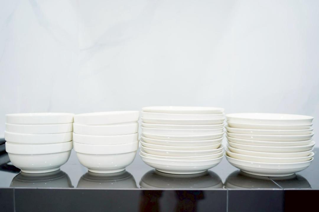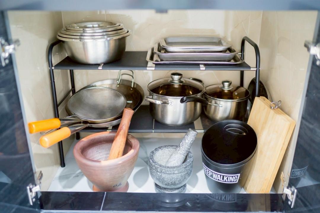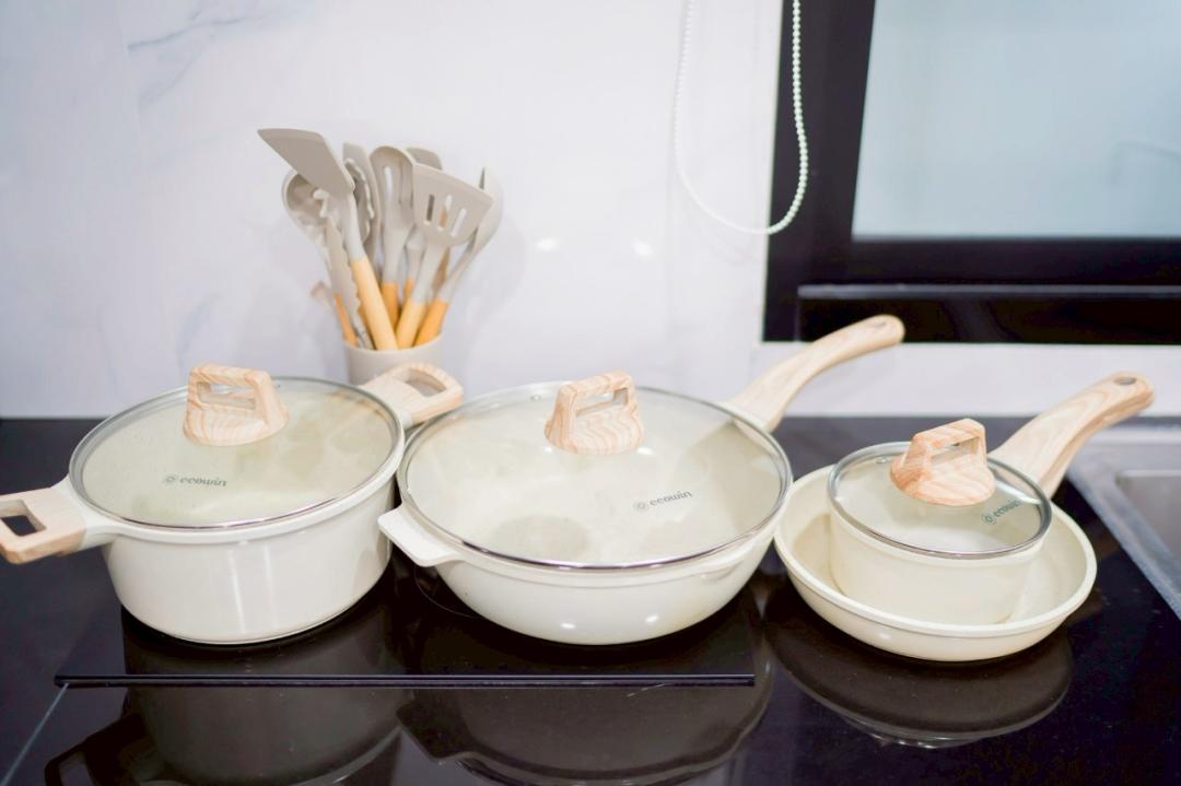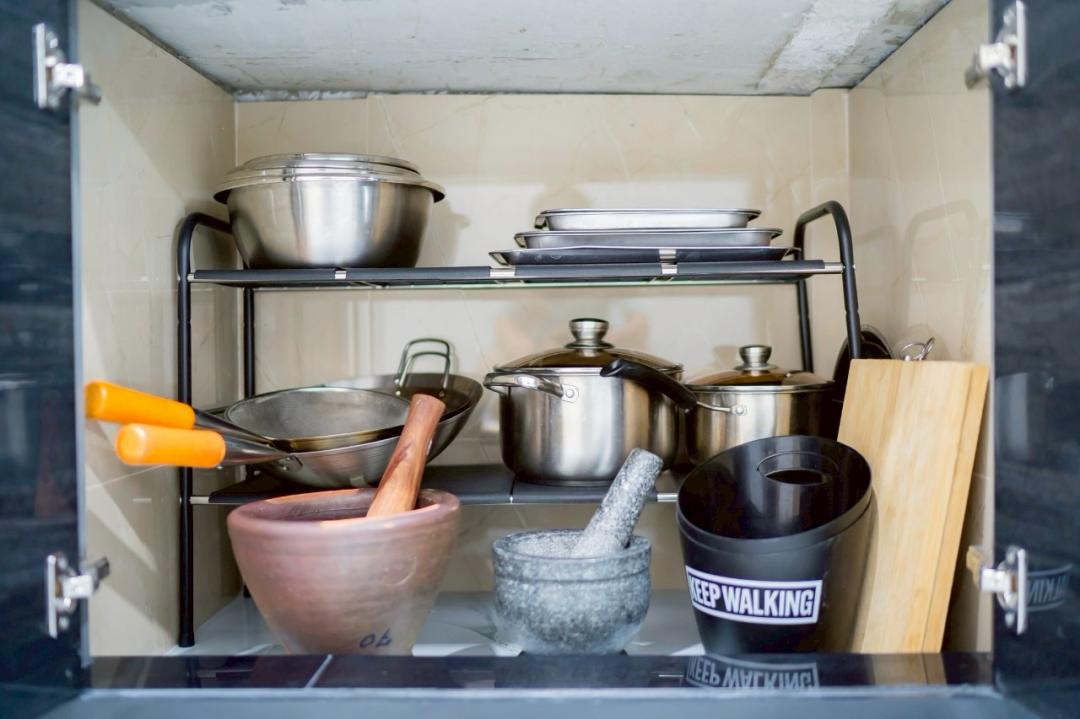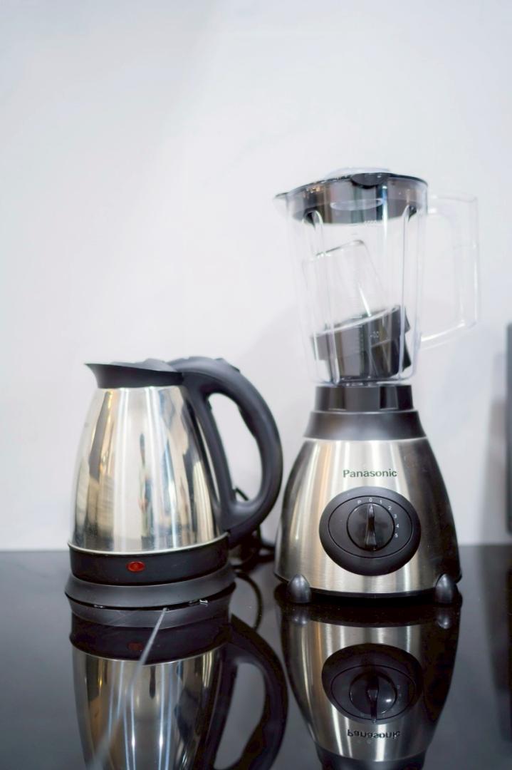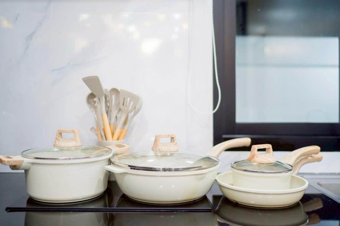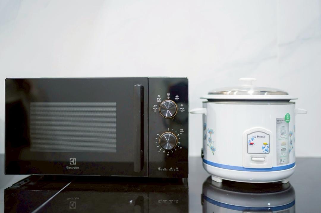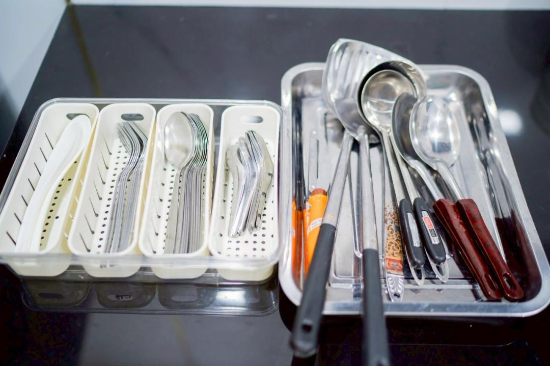 -กะทะ หม้อ หม้อหุงข้าว จาน ชาม ตะหลิว ช้อนส้อม ที่คีบ ไมโครเวฟ แก้ว ถ้วย ถ้วยน้ำจิ้ม มีด เขียง ครก ช้อนเล็ก ช้อนกลาง กะละมัง กาน้ำร้อน ทัพพี ซึ้ง เครื่องปิ้งขนมปัง หม้อนึ่ง